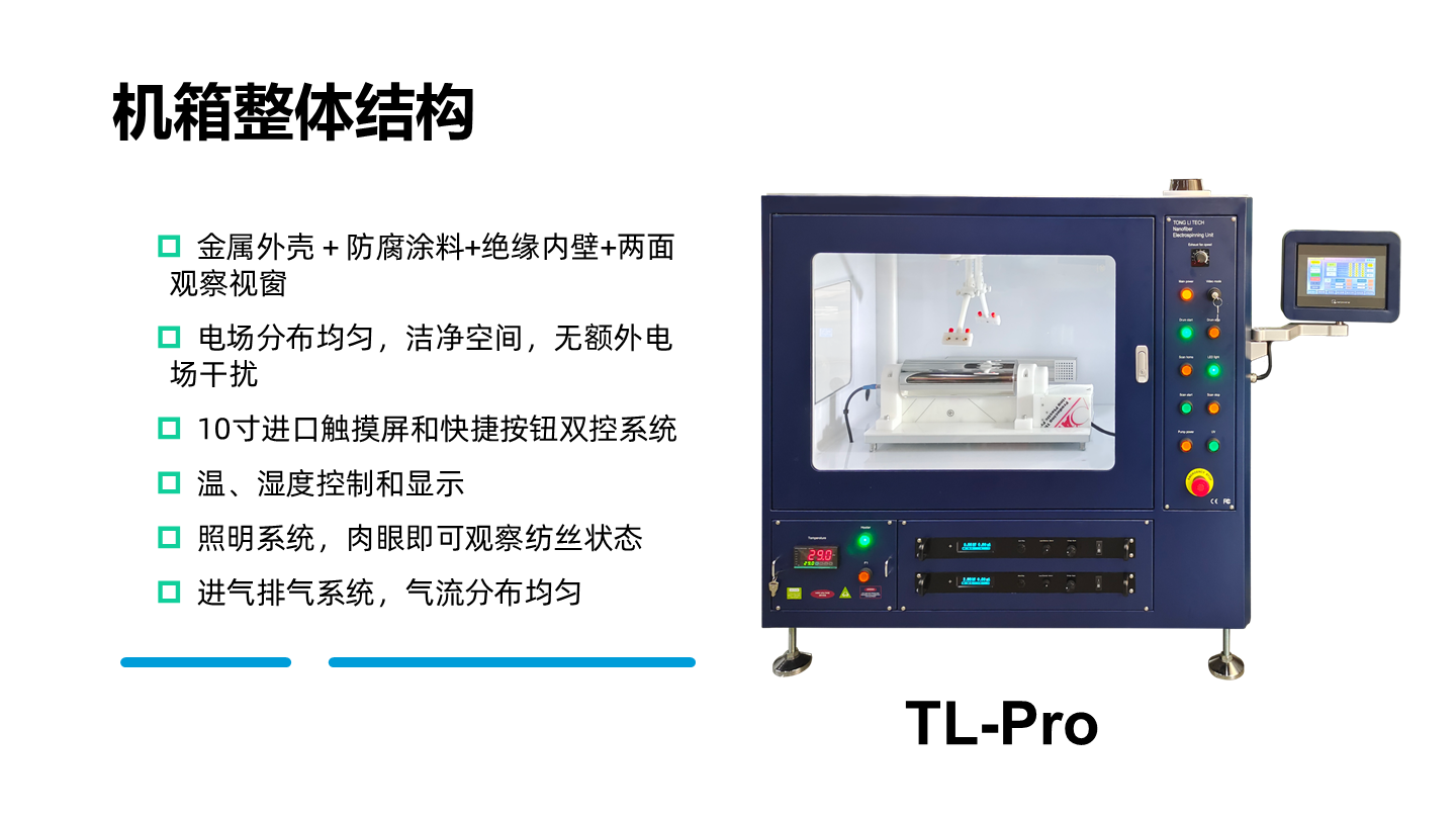 通力微納高壓靜電紡絲機TL-Pro,搭載正負高壓電源,并內置絕緣設計,既確保了紡絲箱的清潔,又保障了操作安全。其設計集成了單噴頭、多噴頭、同軸噴頭和并肩噴頭等多種噴頭系統,以及平板、滾筒、籠狀、超定向、細軸和碟狀等各類收絲器。噴頭與收絲器相互配合運動,同時具備獨立控制的雙通道微量泵,能夠滿足不同的實驗需求。此外,TL-Pro還提供三十余種升級配件,可根據不同的應用方向進行自由組合。這一多功能系統能夠制備多種形態的納米纖維,其產出的纖維膜均勻且厚度可調,保證了納米纖維膜制備的高度重復性。