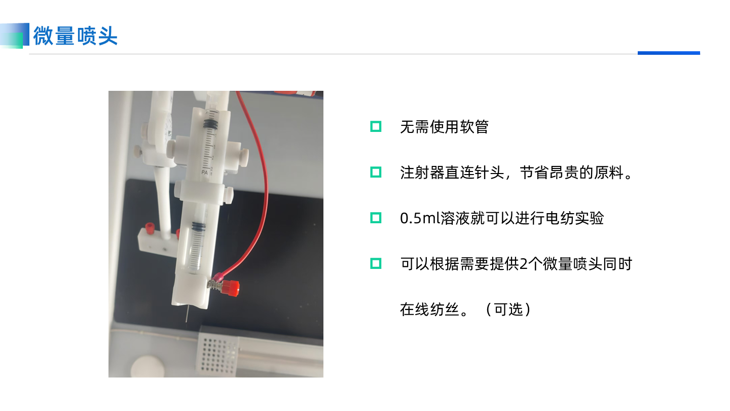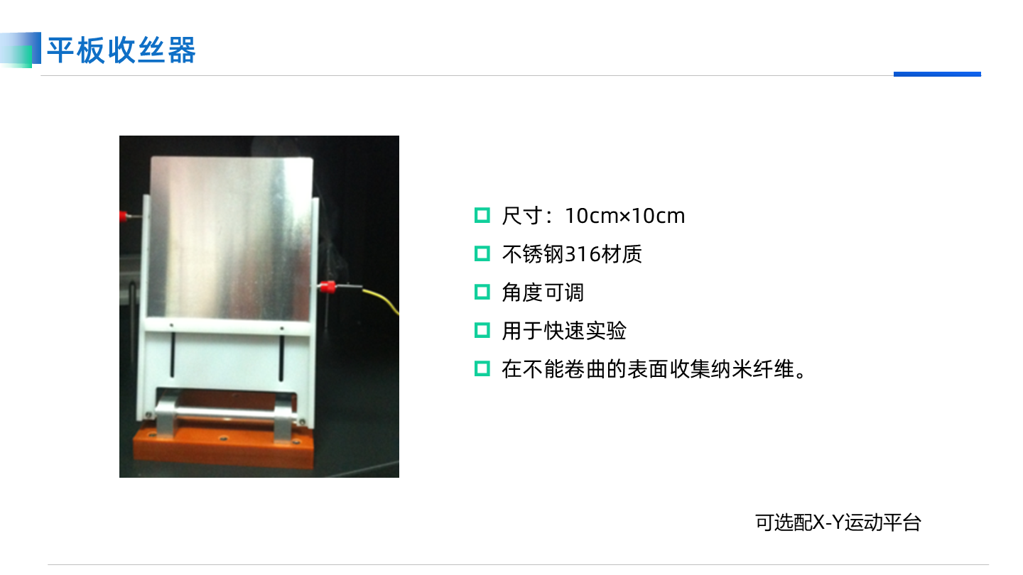 TL-01高壓靜電紡絲機是一款基礎但功能完備的設備,適用于教學和基礎紡絲實驗。它配備了完整的紡絲配件,包括五種不同類型的噴頭和收絲器,能夠實現多種實驗組合,為用戶提供豐富的選擇。