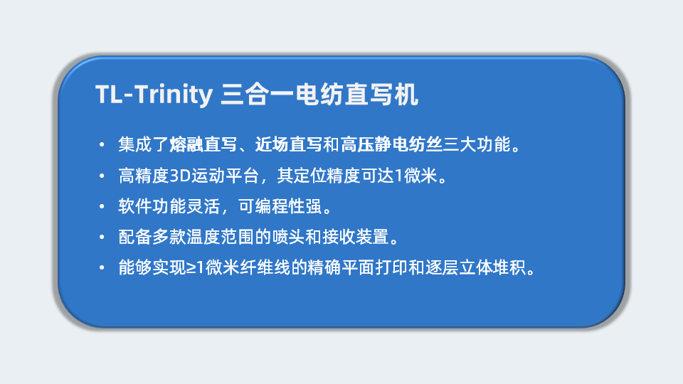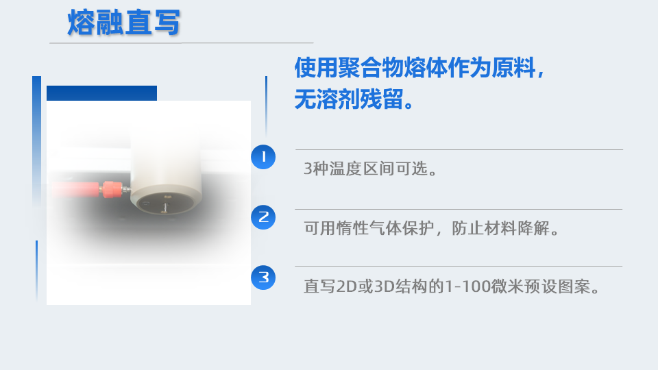 | ? 柔性印刷電子 ? 微納結構3D打印 ? 薄膜晶體管 ? 觸摸屏 | ? 顯示器件 ? 太陽能電池 ? 局部電路修復 ? 微納點膠 | ? 光學器件 ? 細胞打印 ? 組織工程支架 ? 傳感器 |